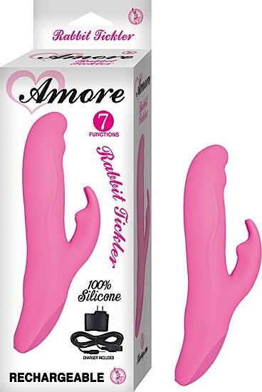 Amore Rabbit Tickler Pink Vibrator features 7 functions. 100% Silicone. Rechargeable USB AC/DC power supply charger included. Waterproof vibrations. Made using phthalate free RoHS compliant materials shaft, clitoral stimulator Silicone, base ABS plastic. Total length 7.5 inches, insertable length 4 inches, overall length 7.25 inches, diameter 1.375 inches, circumference 4 inches.