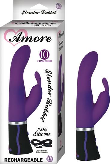 Amore Slender Rabbit Vibrator Purple features 10 functions. Made using latex and phthalate free materials 100% silicone. Rechargeable by USB. Cord included. Features: 100% Silicone. 10 functions. Dual motors. USB charging cable included. Waterproof vibrator. Phthalates free, RoHS compliant materials: shaft Silicone, base ABS plastic. Total length 8.5 inches, insertable length 4.5 inches. Diameter 1.5 inches, Circumference 4 inches. Rechargeable no batteries necessary.