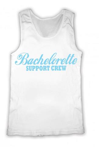 Boybeater Bachelorette Support Crew White Tank Top with light blue lettering heat transfer. Small size fits ladies 6 to 8. For the girls night out. Make her stand out from the crowd with this fun tank top. Electric Lingerie.