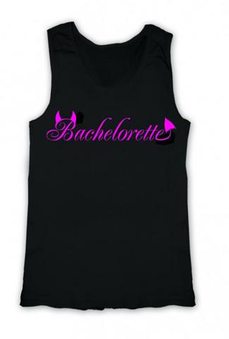 Boybeater Bachelorette with Devil Horns Black Tank Top with hot pink lettering heat transfer. Small size fits ladies 6 to 8. For the girls night out. Make her stand out from the crowd with this fun tank top. Electric Lingerie.