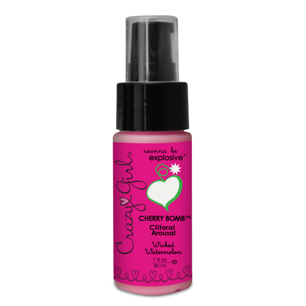 Crazy Girl Cherry Bomb Clitoral Arousal Wicked Watermelon. Wanna Be Explosive Cherry Bomb Clitoral Arousal is a Diva's secret for sensational sex. Arouses clitoral excitement and intensifies orgasmic pleasure with a tingly, cool yet warm sensation. Made with a proprietary blend of Menthol and Peppermint Oil. Kissable flavors to delight foreplay. Cherry Bomb Clitoral Arousal is always Paraben free, Sugar free. Body friendly. Adult sex toy friendly. Latex condom compatible. Available in 5 flavors: Cherry Knockout, Minty Bombshell, Strawberry Sweetheart, Wicked Watermelon, Cupcake Sweetie. Each sold separately. 1 fluid ounce pump bottle. No animal testing. Made in the USA.