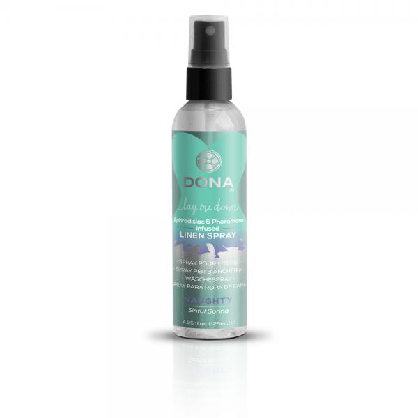 System JO DONA line Lay Me Down Linen Spray Sassy Sinful Spring 4.25 fluid ounces. Add an irresistible invitation to your linens with DONA Linen Spray. Infused with invigorating pheromones and aphrodisiacs, just a few sprays will transform your bedroom into a playful boudoir. Key features: aphrodisiac and pheromone infused. Specially formulated for intimate apparel. Leaves intimate apparel soft and fresh. Available in 3 fragrances: Flirty Blushing Berry, Sassy Tropical Tease and Naughty Sinful Spring. Each sold separately. Made in the USA.