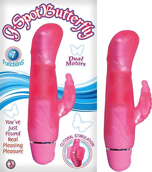 Nasstoys of New York G-Spot Butterfly Pink Vibrator features 7 functions, dual motors. Clitoral stimulation. EZ push button base. Waterproof vibrations. Made using Phthalates free, RoHS compliant materials Thermoplastic Elastomers TPE, Base ABS plastic. Overall length 6.181 inches, Diameter 1.375 inches. Rabbit clitoral stimulator 2.28 inches. Vibrating sex toy requires 2 AA batteries, not included.