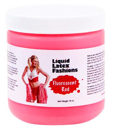 Liquid Latex Fluorescent Red 16 ounces. Fluorescent liquid latex body paint glows under black lights, which makes it great for night clubs and dance parties! At Liquid Latex Fashions.com you will find the only Ammonia-Free Liquid Latex Body Paint. Our special formulation includes FDA approved ingredients that is safe for use on the face and body. One of the most remarkable things about Liquid Latex Fashions Latex Body Paint is that it dries at room temperature and forms a highly elastic rubber. Liquid Latex is not made as a permanent coating on surfaces. It will lift off the skin by itself after several hours of wear. It will not clog the pores nor prevent perspiration from forming. Liquid Latex is permanent on fabrics and clothing. Note: for the Fluorescent colors they highly suggest using 2 coats of our Base coat Foundation prior to applying the Fluorescent color. This will allow for easier application of the Fluorescent Liquid Latex Body Paint and provide a more vibrant color with fewer coats. One of the most remarkable things about Liquid Latex Fashions Latex Body Paint is that it dries at room temperature and forms a highly elastic rubber. Liquid Latex is not made as a permanent coating on surfaces. It will lift off the skin by itself after several hours of wear. It will not clog the pores nor prevent perspiration from forming. Liquid Latex is permanent on fabrics and clothing. Liquid Latex Body Paint 16 ounces covers arms and legs of 1 individual