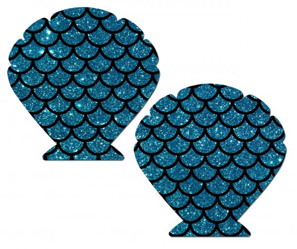 Mermaid: Glitter Turquoise Scales Seashell Nipple Pasties by Tease. Seashell nipple pasties are made of durable, no mess glitter faux leather material that forms to curves and resists wrinkling over hardening nipples. Just peel and stick on clean, dry skin! All Tease pasties feature latex free, medical grade, waterproof adhesive that stays securely in place for as long as you like and until they are gently removed. Made in the USA. Splish, splash! Dimensions 3.1 inches wide by 3 inches tall. Coverage 2.8 inches. Invite playful temptation and Soulful Seduction with Tease designer nipple pasties by Pastease Brand.