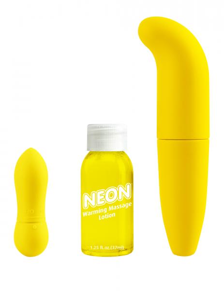 Neon Luv Touch Fantasy Kit Yellow. Turn your night into a night of naughty fun with this radiant Neon Fantasy Kit! This pleasure kit is the perfect starter kit, and has everything you need to get your party started. The powerful mini bullet offers incredible pulsation directly to your most sensitive spots, while the cleverly curved G-Spot stimulator will hit just the right spot for the most explosive stimulation you have ever imagined! Heat things up with an erotic massage prior to playtime using the Neon Warming Massage Lotion!