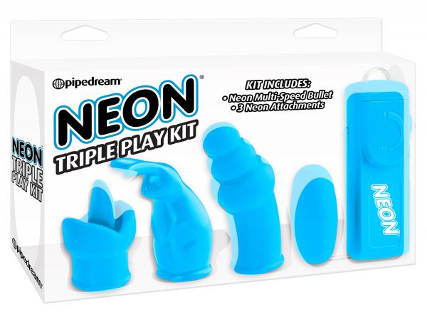 Neon Triple Play Kit Blue three sleeves and one vibrating bullet with attached power control. Perfect for first timers, the Neon Triple Play Kit is just what you need for explosive clit stimulation. Made from super smooth phthalate free, body safe PVC, this mini vibe kit features a powerful multi-speed bullet and three unique attachments for endless possibilities of pleasure. Cleanup is a snap after the fun with toy cleaner and warm water. Features: attached remote control, Multispeed, G-Spot. Bullet vibrator requires 2 AA batteries, not included. Materials ABS Plastic, PVC.