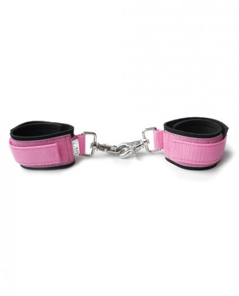 Cuffs are fully washable. Made using nickel-free metal to prevent allergies. Hypoallergenic rubber free neoprene also is great for individual with latex sensitivities. Plus vegan friendly contains no animal products. Each cuff measures up to 10 inches. Can be used to restrain wrist or ankles in females or wrist in males may be a little too short to accommodate a man's ankles. Shown in both available colors in pink on black or all black. Item number KL921 All black cuffs, KL922 Pink on black cuffs. Sex Toy Model is wearing the pink and black cuffs. Each sold separately. Kinklabs.