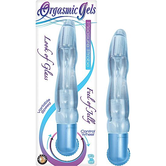 Orgasmic Gels Pleasure Probe Blue Vibrator. The look of glass, feel of jelly. Easy to use. Control wheel. Variable speed. Made using phthalates free, RoHS compliant materials: shaft Thermoplastic Elastomers TPE, Base ABS plastic. Insertable length 6.5 inches. Vibrating sex toy requires 2 AAA batteries, not included. Do not leave batteries in the vibrator between uses. Always clean before and after use. Orgasmic Gels Pleasure Probe Vibrator from Nasstoys of New York. The best in adult toys!