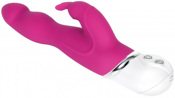 Features: powerful rabbit vibe with rotating shaft. 3 rotation setting: clockwise, counter clockwise, combination. Shaft angled tip targets G-Spot. Soft and flexible clitoral bunny. 10 intense speed and vibration functions. Dual motors in tip and bunny. 9.75 inches long, 5 inches insertable length, 1.4 inches wide. Silky smooth silicone shaft and bunny. Pearl finish ABS plastic base. Body safe, phthalate free and latex free. Vibrator requires 4 AAA batteries, not included. Sold separately.