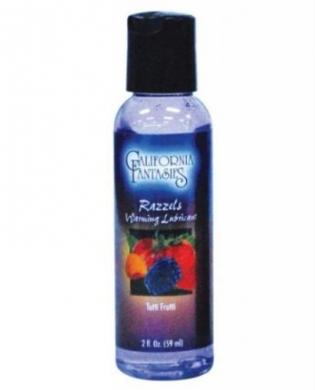 California Fantasies Razzels Warming Lubricant is available a new Tutti Frutti Flavor. Each sold separately. Excellent lubricant that warms and tastes great! Yummy flavors with no bitter after taste and sugar free. Warms as you rub it in and gently blow on it. Latex condom compatible. Sex toys friendly. Available in 2 ounces and 4 ounces bottle. Instructions for use: apply a small amount of Razzels Flavored, Warming Lubricant to the desired areas of the body you wish to lubricate. Romance your lover by caressing their skin with your fingers then gently blowing on it to give them an enticingly warm sensation. With an arousing kiss of the lips, you will taste Razzels pleasurable flavor. Razzels will keep you coming back for more so take your time and let your senses be dazzled! Razzels Warming Lubricant from California Fantasies. California Fantasies personal care products for romantic pleasures. New image added December 16, 2012.