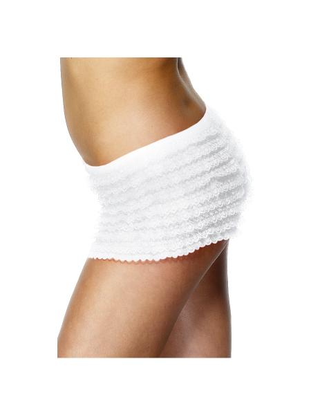 Sheer Desires Ruffled Panties White with Lace one size fits most. Sexy low riding panties make a great costume accessory. Suitability and safety: Adult fancy dress costume. Not for children. Care: Dyes may not be color fast. Warning keep away from fire. Hand wash separately. Display box. Taking pride in everything we do serious fun. One size fits ladies size 0 to 8. Ruffled Panties from Smiffy's Fancy Dress Experts.