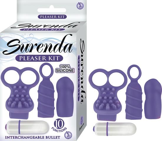 Surenda Pleasure Kit Purple. 10 function bullet vibrator. 100% Silicone. 3 interchangeable sleeves: Finger Sleeve, Twisty Sleeve, Nubby Sleeve. Waterproof vibrations. Phthalates free, RoHS compliant materials: sleeves Silicone, Bullet vibrator ABS plastic. Sizes: Nubby Sleeve 3 inches, Twisty Sleeve 3 inches, Finger Sleeve 2.125 inches, Bullet length 2.375 inches, width 0.75 inch, circumference 2.5 inches. 3 AG13 batteries, included.
