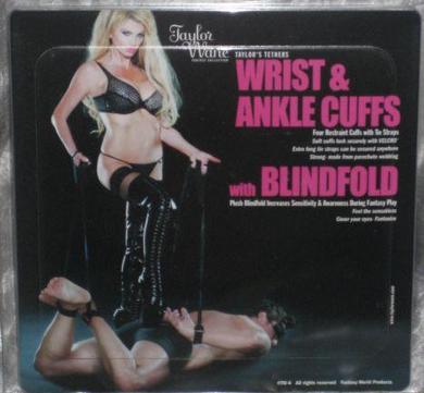 Four restraint cuffs with tie straps and a blindfold. The soft wrist and ankle cuffs lock securely with velcro and extra long straps that can be secured anywhere.