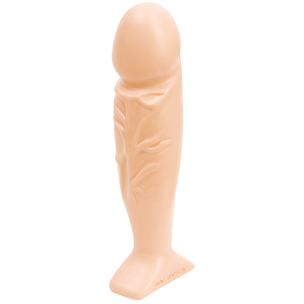 Thick beige rubber dong with thick veined texture and T base. 7 inch length, 1.75 inch width.