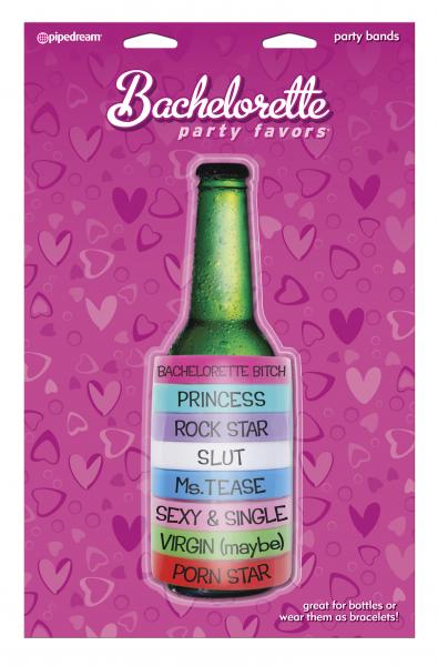 Bachelorette Party Favors Party Bands 8 Pack are great for labels on bottle, can drinks. Can also be worn as bracelets too.Perfect for the Bachleorette Party! Make the girls last night out an unforgettable one with these hilarious Bachelorette party favors. Pipedream Products design, create and innovate the best novelties and party gifts in the world. Their pledge is simple: they guarantee to make them laugh! It is not a party without Pipedream Products! Packaged Weight 2.75 ounces. Package Type Blister Card. Features and Functions: Bachelorette Party Favors, Adult Novelties. Materials Rubber, Jelly. Country of origin Hong Kong. Harmonized Tariff Schedule HTS Code 9505904000.